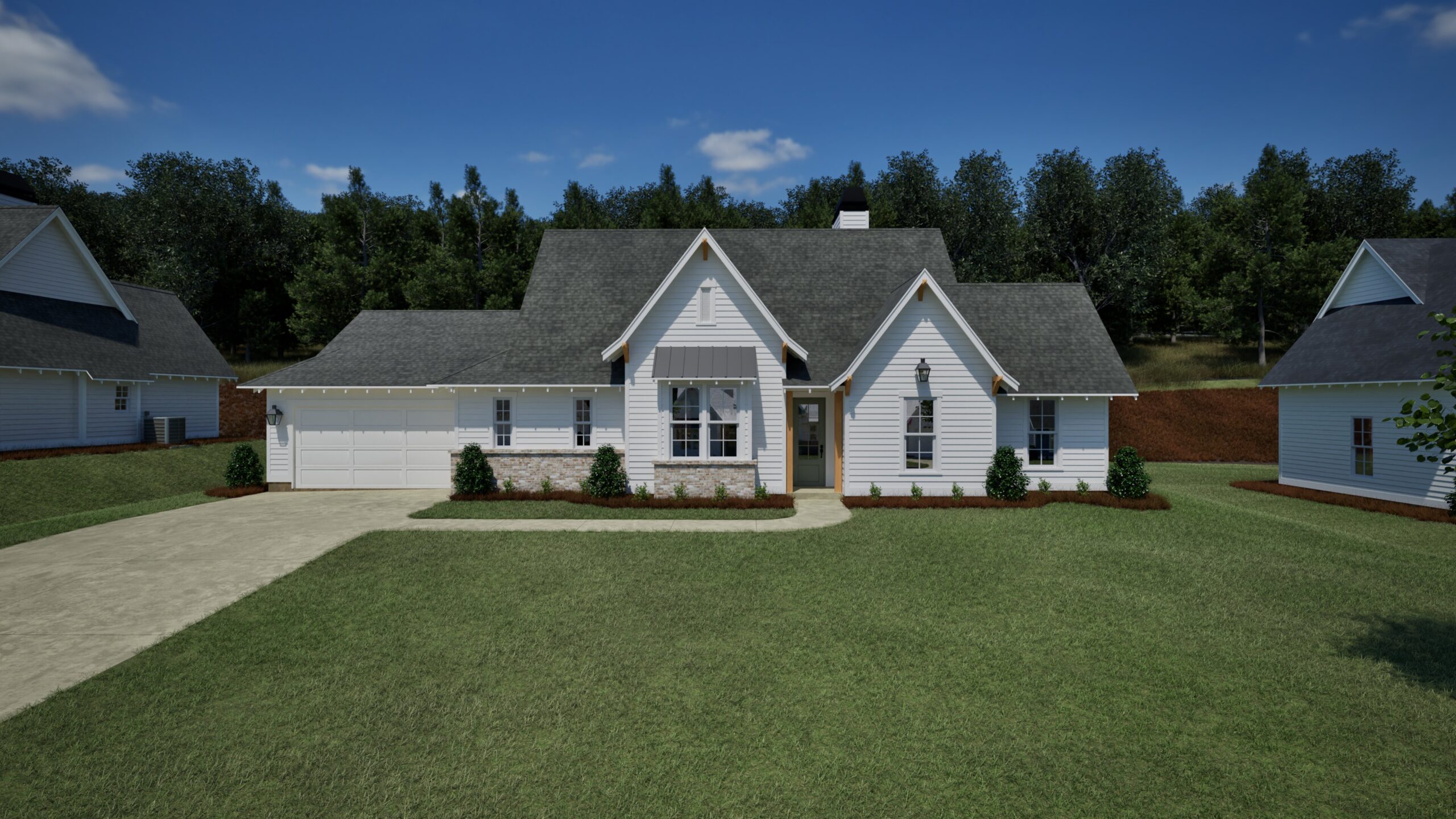 Welcome to The Charlotte A floor plan! The Charlotte features four bedrooms, two bathrooms and spans across 1640 square feet. As you enter into the home, you enter into the foyer that leads into the living room that has vaulted ceilings, large windows that overlook the covered back porch, and a wood burning fireplace as the focal point of the room. The living room flows into the kitchen and dining room as well as the laundry room and two car garage. The Primary Suite is behind the kitchen and features large windows in the bedroom, a spacious primary bathroom with a double vanity and walk-in tile shower and walk-in closet. Tucked behind the living room are the three guest bedrooms that share a hall bathroom with a double vanity.