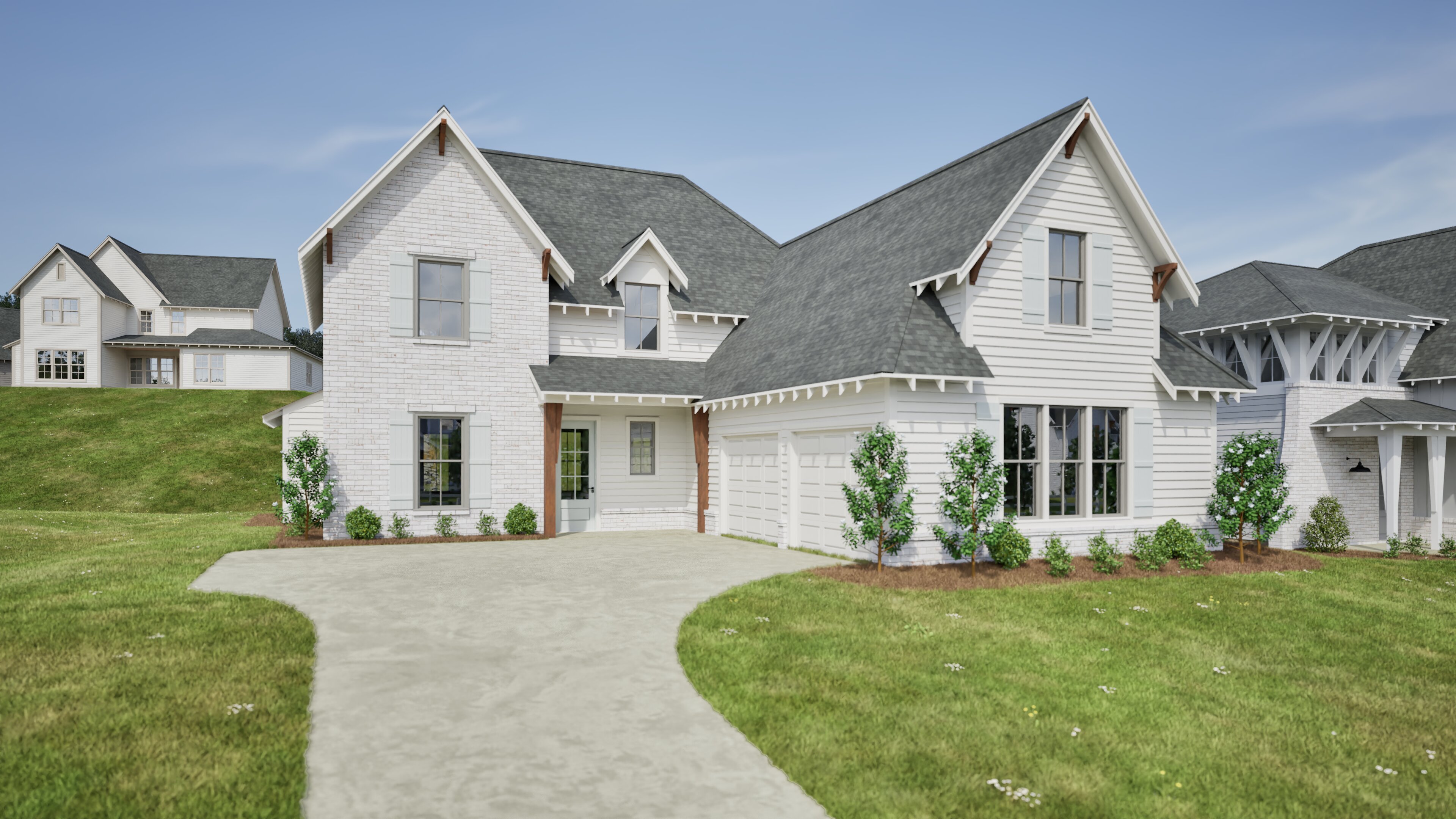 Experience thoughtful design and everyday luxury with this beautifully crafted two-story floor plan, created to bring comfort, convenience, and style together under one roof. Move into your dream home with the Hattie B - a 4 bedroom, three and a half bath with 2,397 square feet home. The main level centers around an expansive great room that flows effortlessly into the dining area and chef-inspired kitchen, complete with a large island, walk-in pantry, and easy access to the covered porch — perfect for indoor/outdoor living. The main-level primary suite offers a serene retreat featuring a spa-style bath with dual vanities, a garden tub, and a spacious walk-in closet. Additional conveniences include a dedicated drop zone, full laundry room, powder bath, all ideally located near the garage entry to support busy lifestyles. Upstairs, three generously sized bedrooms provide ample space for family or guests, with two well-appointed bathrooms designed to offer privacy and ease. A versatile homework area adds flexibility for studying, gaming, or lounging.